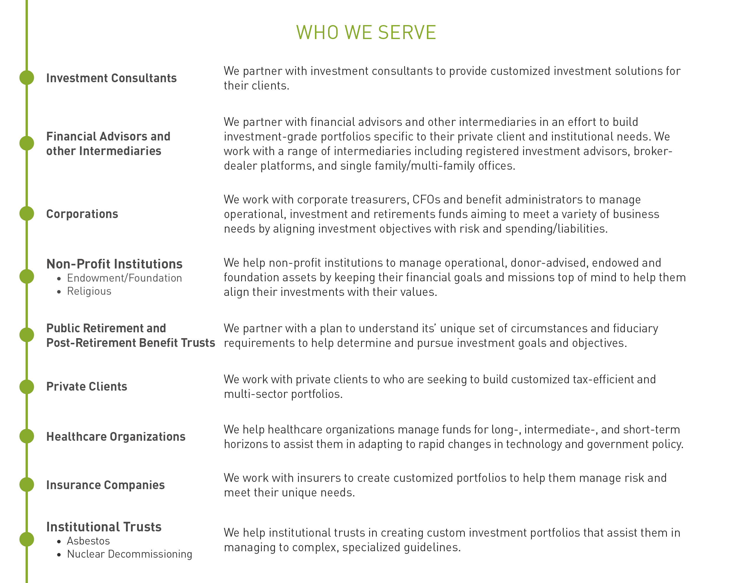 In each relationship, we work to understand the investor's goals. We develop and execute strategic solutions intended to reach those goals, working in an integrated and collaborative approach across our organization. Our clients include both taxable and tax-exempt investors.