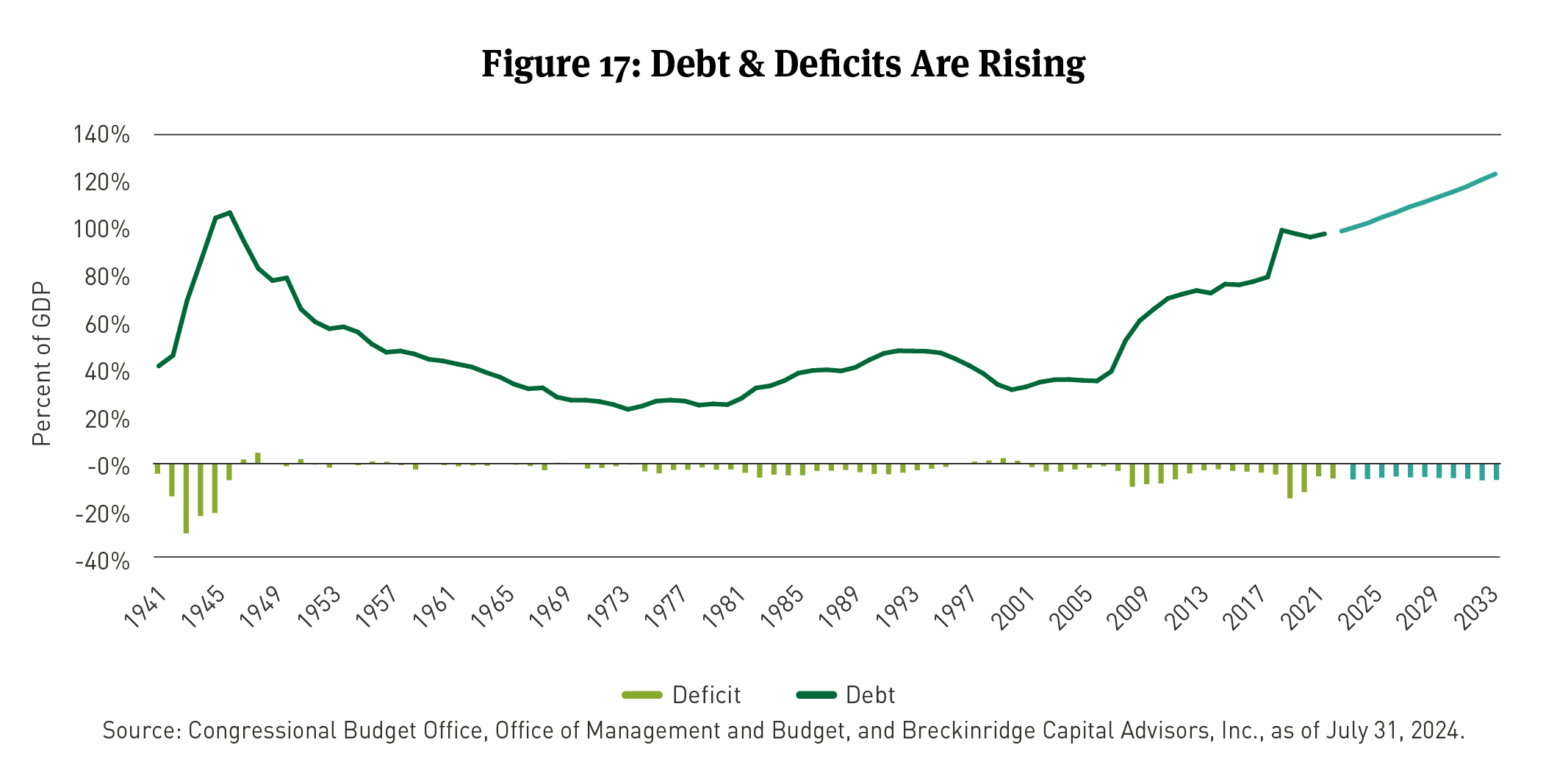 - The deficit. As we have outlined in prior Outlooks, the federal government’s unsustainable fiscal trajectory creates ongoing risks for municipal bonds, as an asset class. This year’s heightened federal-grant and tax risk underscores this reality, as the potential for fiscal consolidation grows (See Figure 17). Investor jitters in some developed sovereign bond markets, including the U.K., France, and Japan, hint at growing potential for a fiscal-disciplining event in the Treasury market, as well.