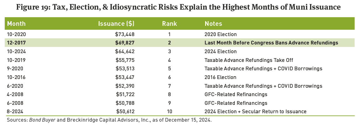 There is also the possibility that Congress considers altering the tax exemption. This could spur additional issuance. For example, we anticipate that some private activity bond (PAB) issuers will pull forward transactions out of concern that Congress curtails their access to the exemption after 2025. (Private activity bonds often include airport, hospital, housing, private college, and industrial development financings, among others.) For perspective, issuers rushed to market in December 2017 before the TCJA eliminated the option to advance refund securities. Historically, tax changes, elections, and idiosyncratic risks have driven large months of issuance (See Figure 19).
