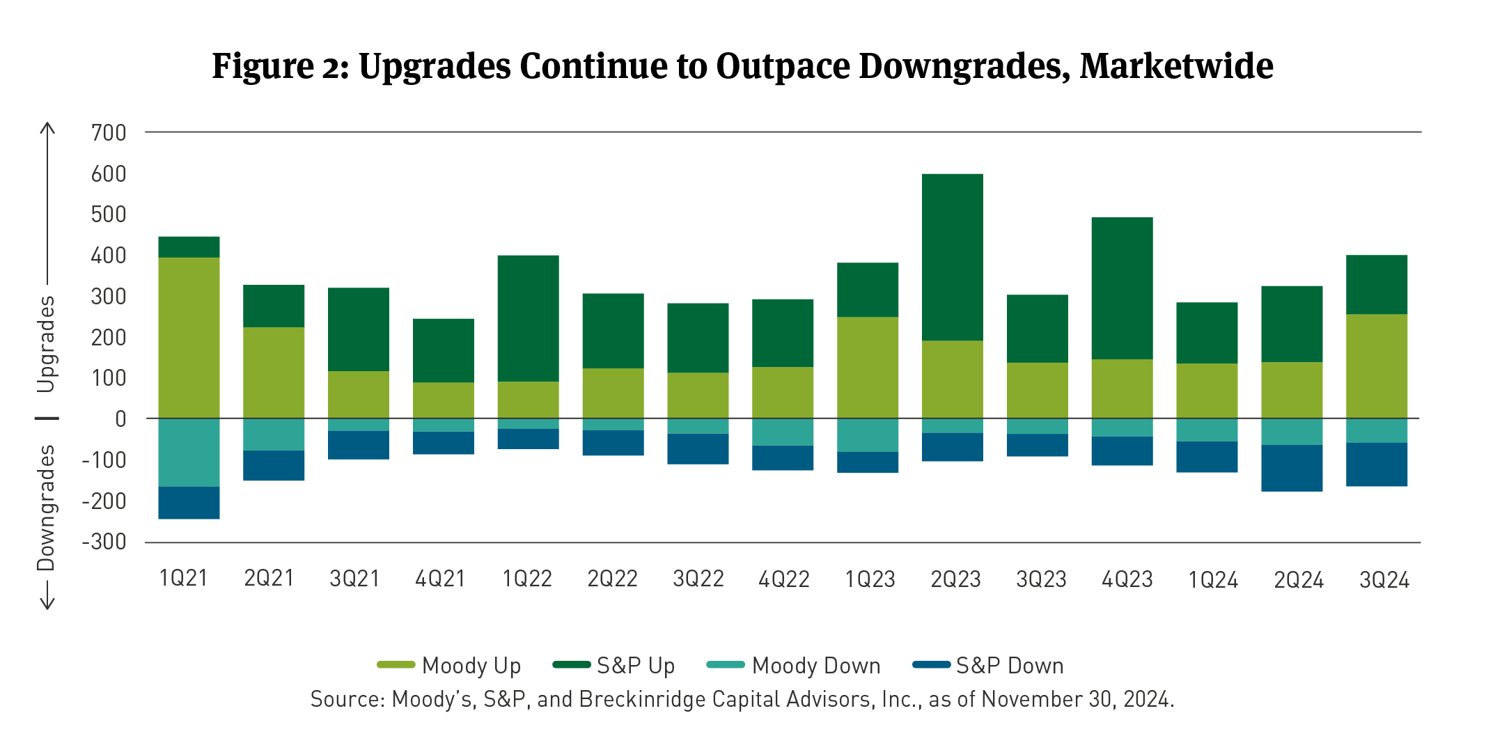Upgrades continue to exceed downgrades at both Moody’s Investors Service (Moody’s) and S&P Global Ratings (S&P) entering 2025. At Moody’s, only two sectors had an upgrade/downgrade ratio below 1.0x in 2024 (hospitals: 0.5x and higher ed: 0.17x).4 At S&P, five sectors had a ratio below 1.0x (charter schools: 0.4x, higher ed: 0.7x, hospitals: 0.3x, public power: 0.9x, and water/sewer utilities: 0.5x).5