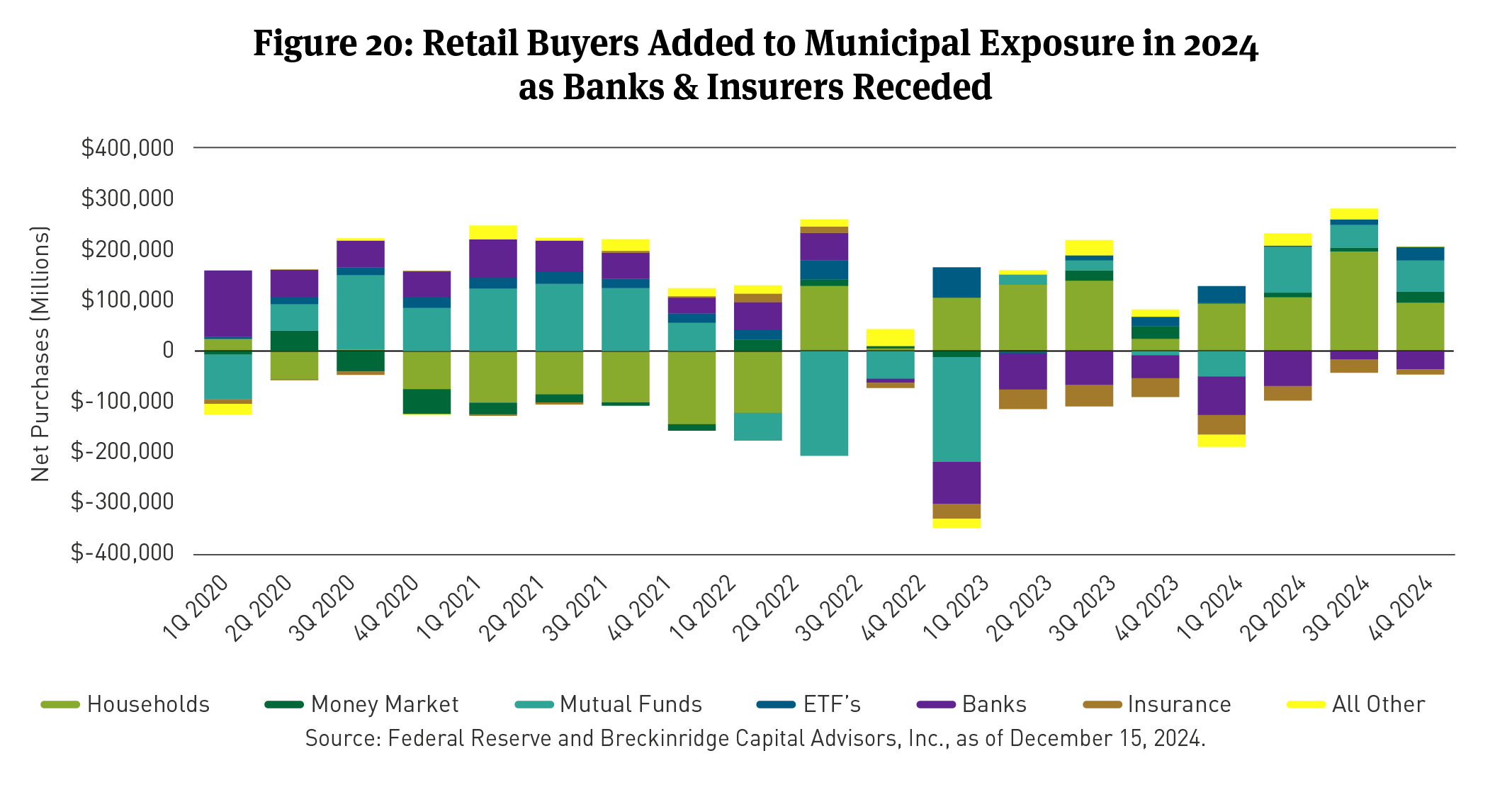 In 2024, the market grew more reliant on retail demand via separately managed accounts (SMAs), exchange-traded funds (ETFs), and mutual funds. Banks and insurers continued to be net sellers of municipal securities (See Figure 20).