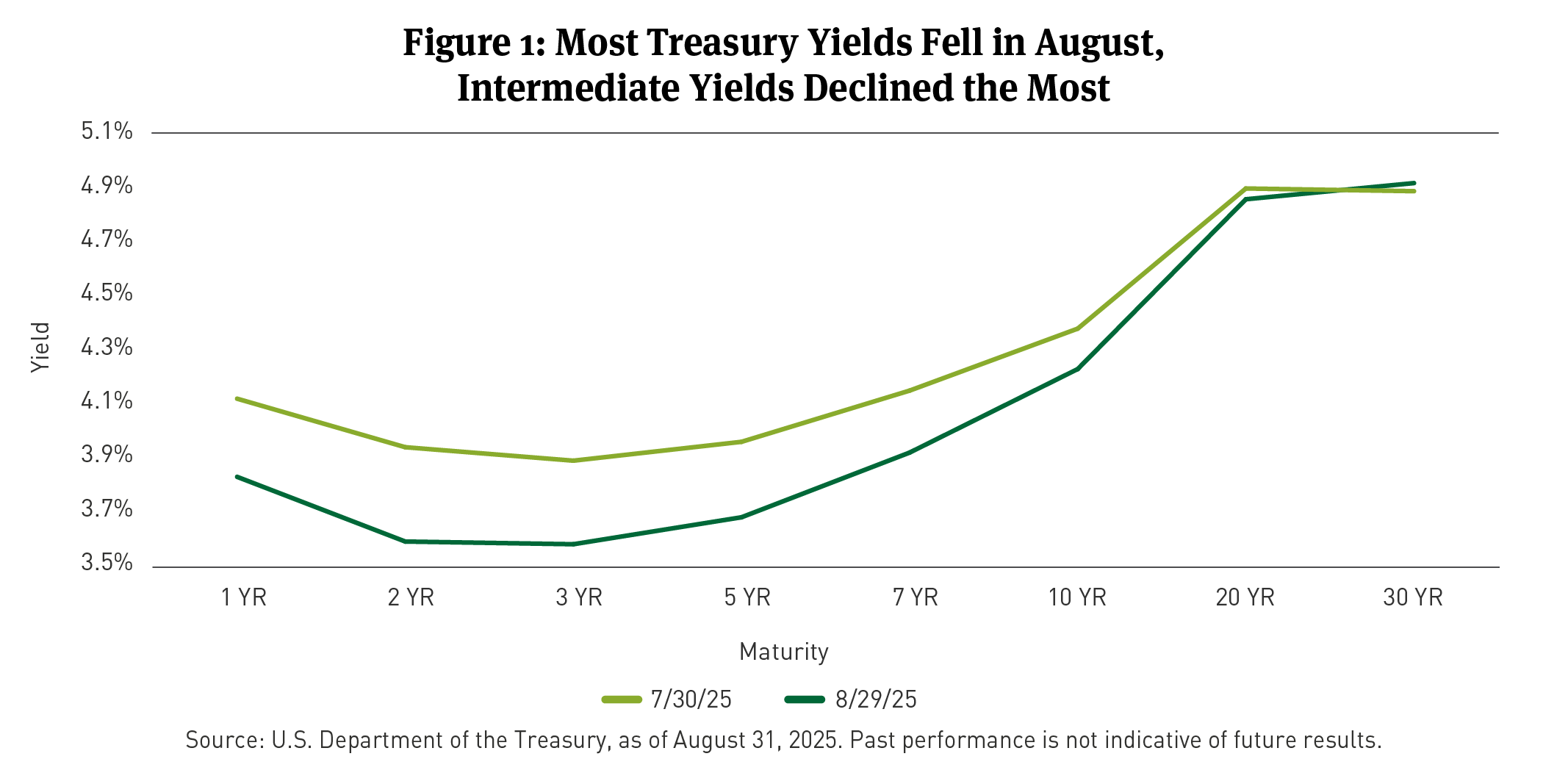 Treasury yields experienced noteworthy declines in August, with the 2-year, 5-year, and 10-year yields falling by 34, 28, and 15bps, respectively (See Figure 1). The 30-year yield, however, saw a slight increase of 3bps. The Bloomberg U.S. Treasury Index3 recorded a total return of 1.06 percent for the month.