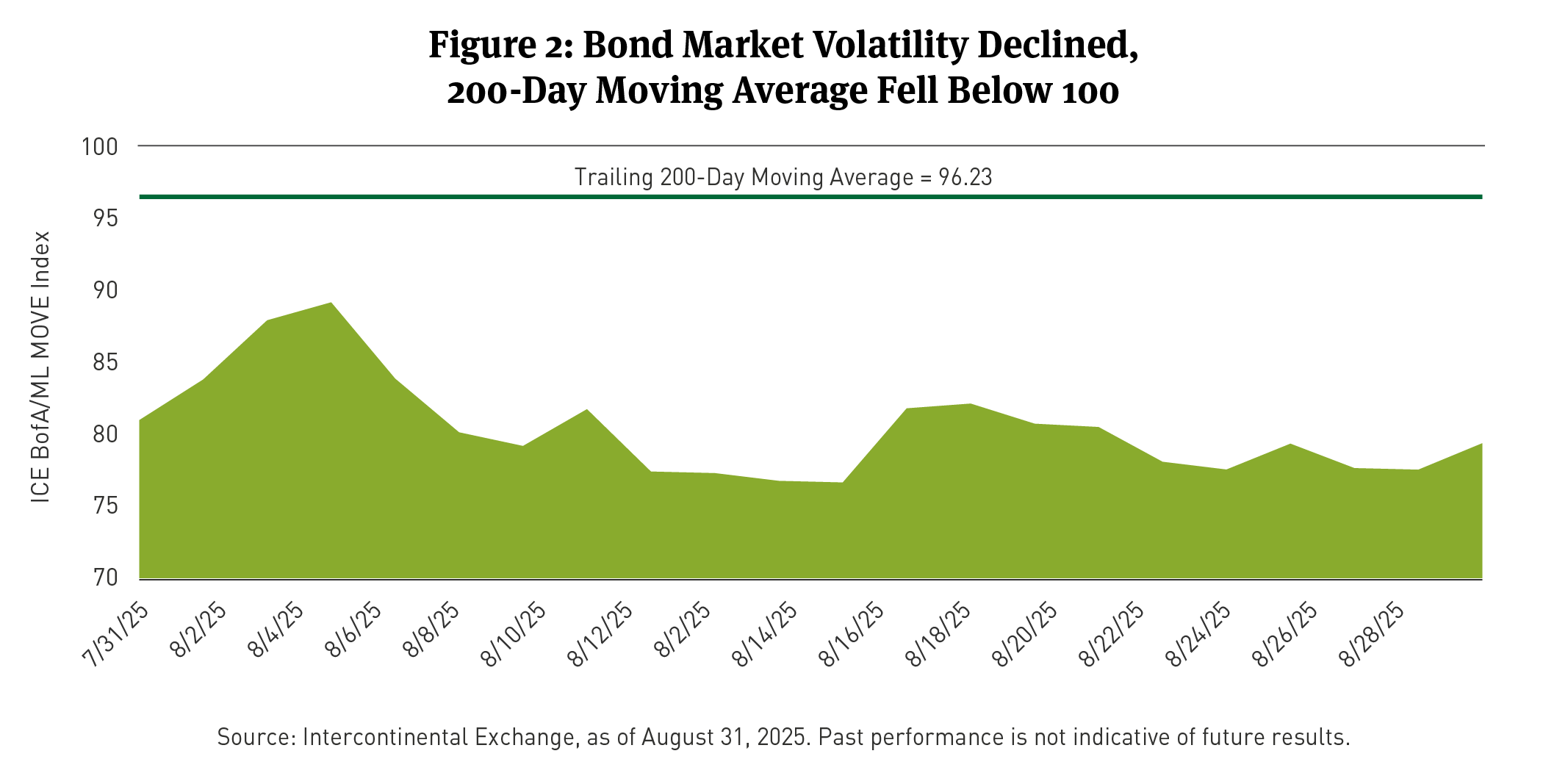 The S&P 500 Index returned 2.03 percent in August 2025, marking a positive month for U.S. equities. The VIX Index, a measure of market volatility, experienced a decline, ending the month below the 200-day moving average, indicating a reduction in market uncertainty and investor anxiety (See Figure 5).
