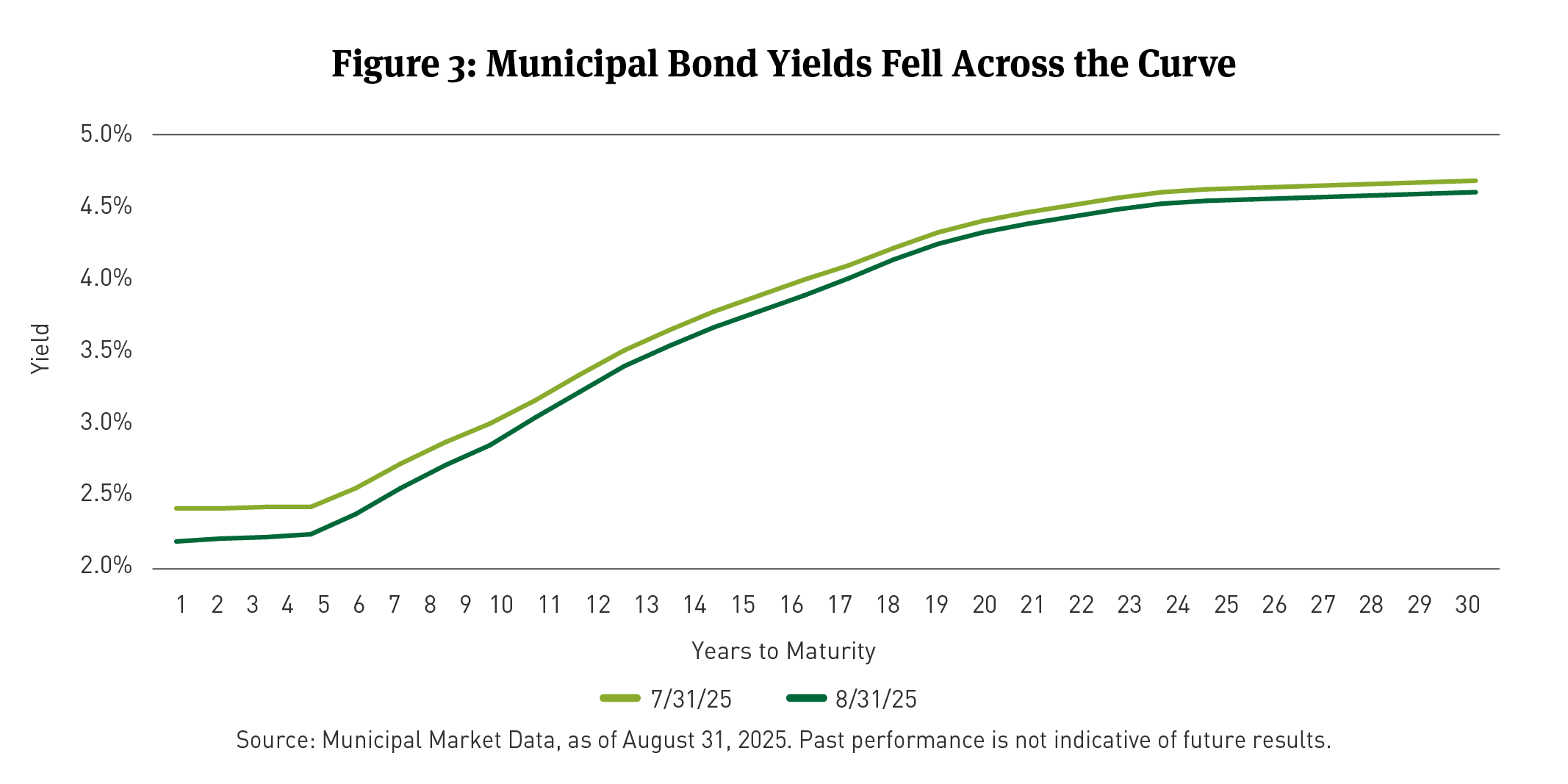 The Bloomberg Short/Intermediate Municipal Bond Index (the Index), which tracks the performance of municipal bonds with maturities between 1 and 10 years, returned 0.85 percent in August 2025. This performance was driven by a combination of stable yields and positive fund flows. The Index's total return was slightly lower than the U.S. Treasury Index, which returned 1.06 percent.