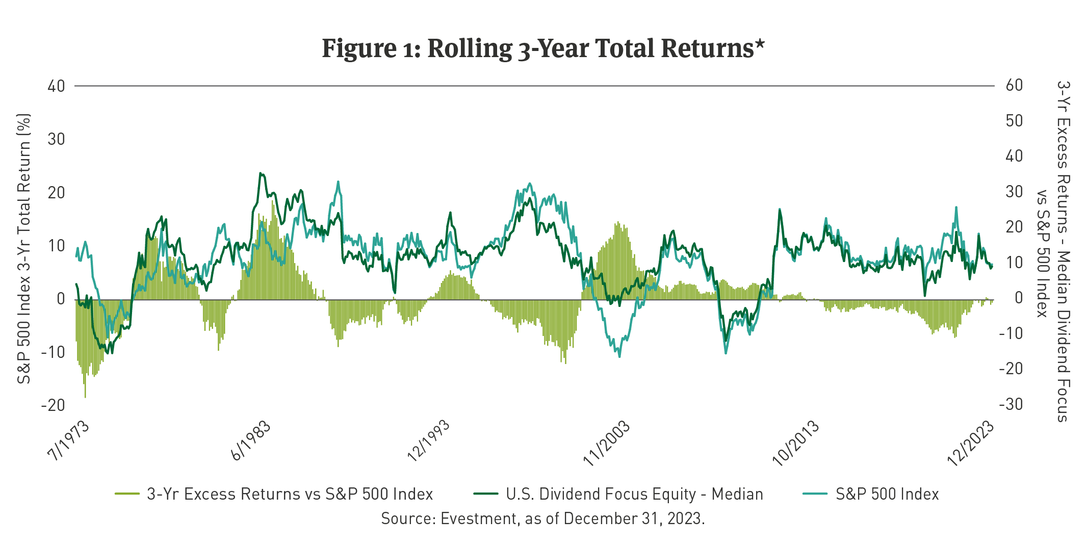 Since the 1970s, dividend focused equity strategies have had discernable and prolonged periods of out- and under-performance relative to broad markets, as measured by the S&P 500 Index1 (See Figure 1). Over the last 10 years, large-cap dividend payers have underperformed the broad market, however most of that period was characterized by exceptionally easy monetary conditions. We believe that the end of the era of easy money policies marked an inflection point and a recent policy reset should fuel a more favorable environment for dividend-paying equities in 2024 and beyond.