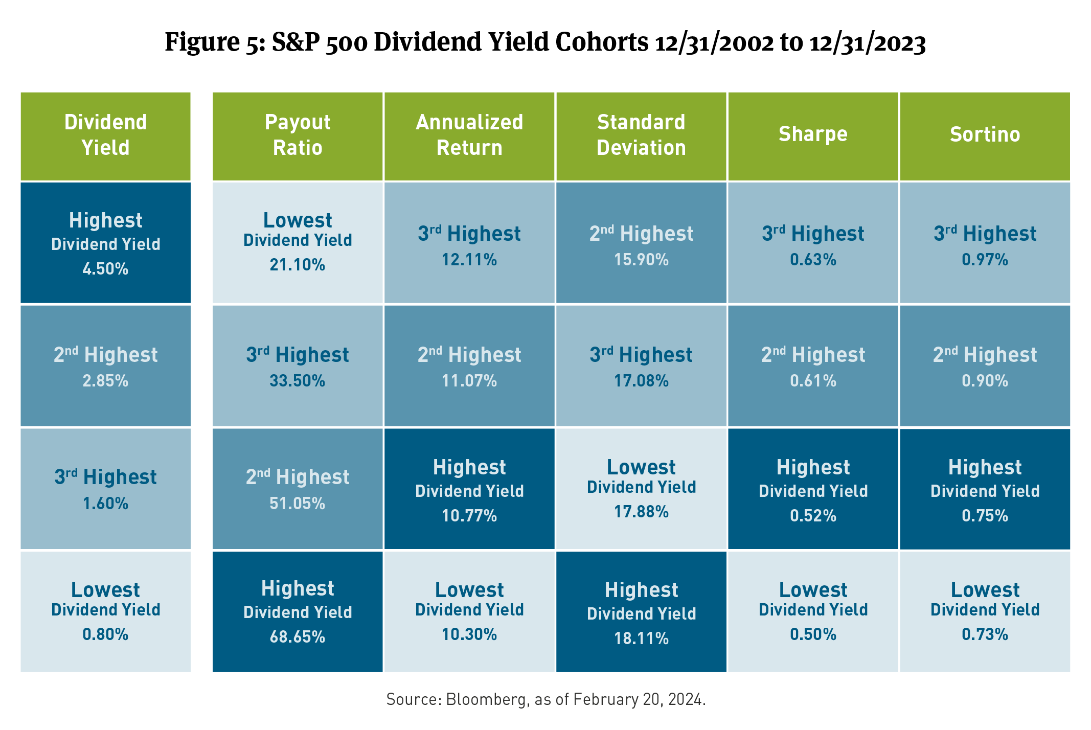 In fact, more than 40 percent of the cumulative total return of the S&P 500 for the period from 1930 through 2022 stems from the reinvestment of dividends, exhibiting the power of the compounding effect and the benefits of a structural allocation towards dividend paying equities, according to The Power of Dividends, Past, Present and Future.9 In addition, the same report finds that over time, stocks offering the highest level of dividend payouts underperformed those that pay high, but not the very highest, levels of dividends. While the highest dividend payers had higher payout ratios, dividend payments were not sustainable at those levels, and were followed by dividend cuts and negative stock price response in downturns. Our analysis shows that the highest dividend yielding companies have elevated payout ratios and these companies have underperformed the 2nd and 3rd highest dividend yielding cohorts over a 20 year horizon on both an absolute and risk adjusted basis (See Figure 5).