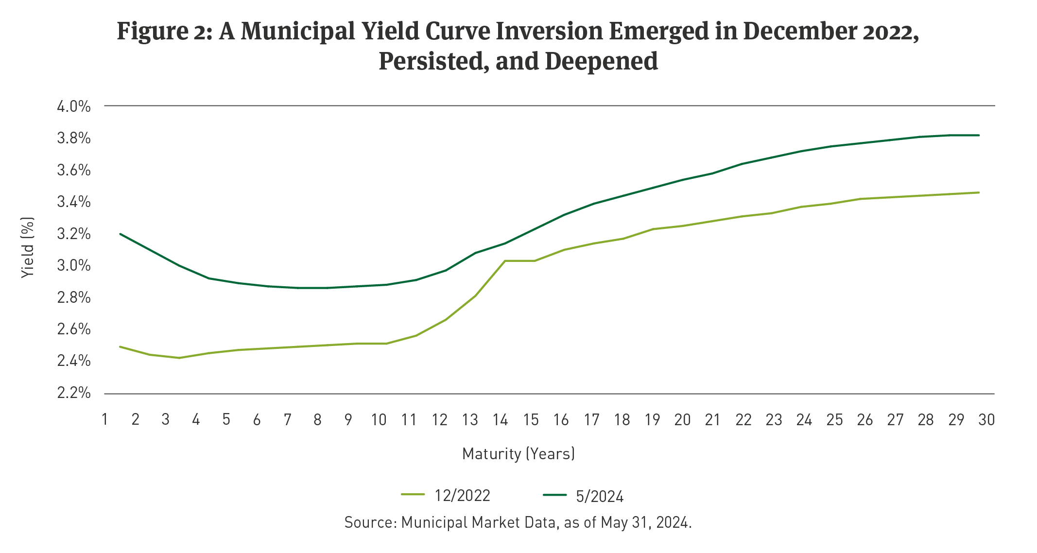 Changes in the shape of the yield curve: The yield curve inverted in the middle of December 2022 and remains inverted as of May 31, 2024. With higher yields available to investors at the short and long ends of the curve than in the middle or belly of the curve, we feel that active management of yield curve positioning is very relevant again.