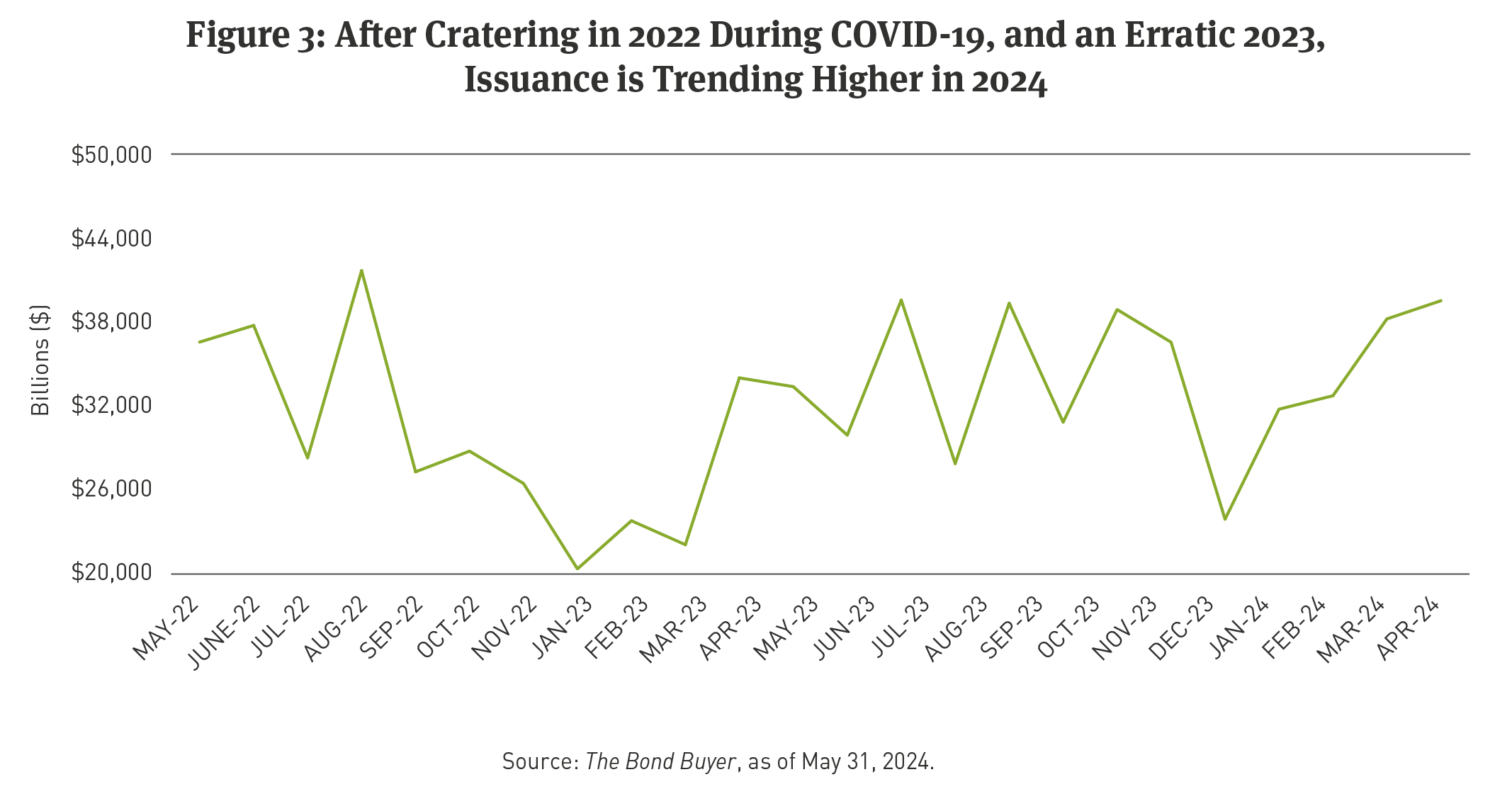 Market liquidity and bond issuance: The pace of municipal bond issuance has accelerated in 2024. Increased liquidity in the market offers opportunities to find value through trading strategies. In addition, higher bond issuance in the primary market results secondary market flows and spread widening which we view as an opportunity. Laddered approaches may unnecessarily confine consideration of new bonds to a limited opportunity set defined by a specific maturity term.