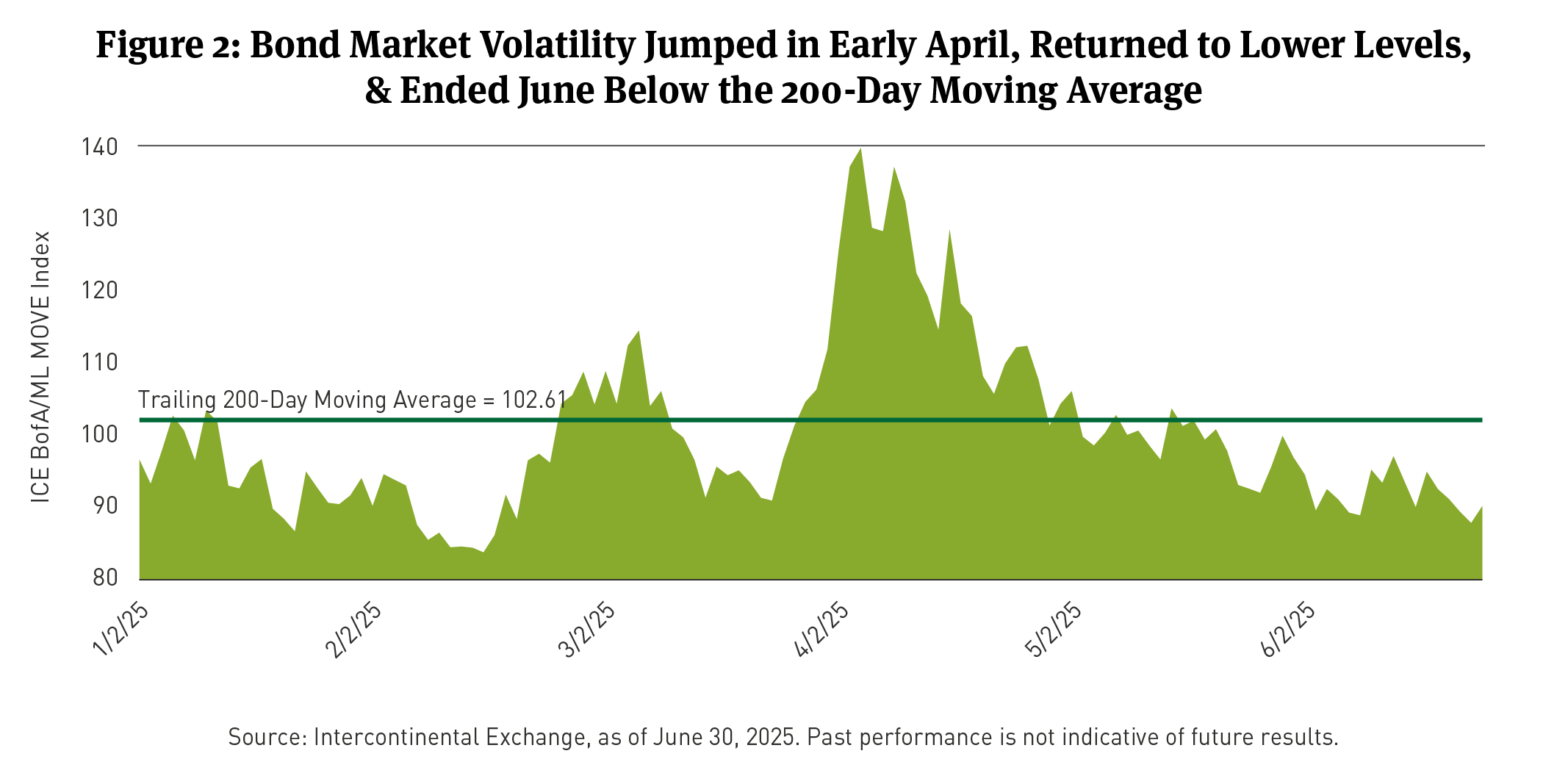 In June, Treasury yields from two years and longer moved lower in a parallel fashion. During the second quarter, the Treasury yield curve twisted steeper notably during the quarter, with the 2- and 5-year maturities falling 16 and 15bps, respectively, while the 10- and 30-year yields were 2 and 20bps higher, respectively (See Figure 1). Bond market volatility was at low levels, as measured by the Intercontinental Exchange Bank of America/Merrill Lynch MOVE Index declined (See Figure 2).