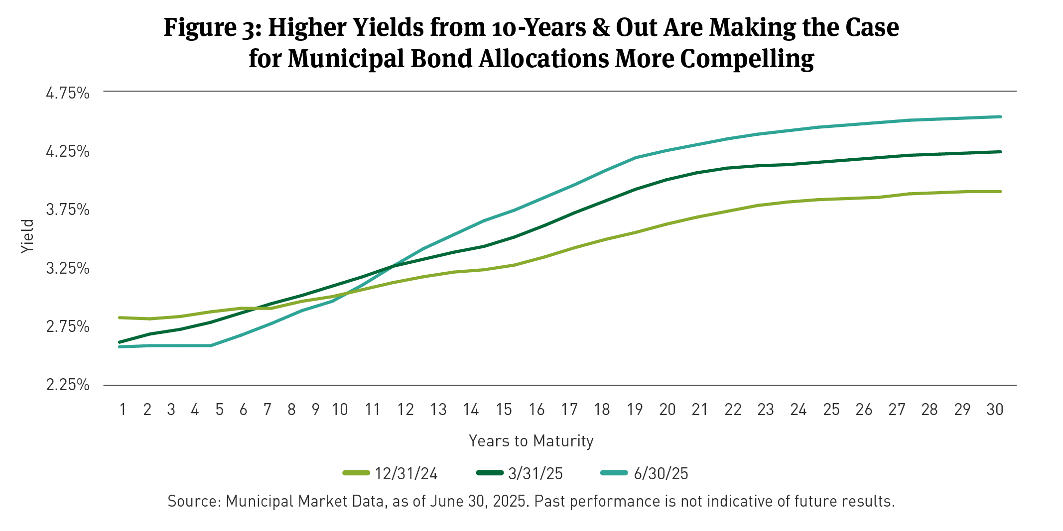 Yields for 2-, 5-, 10-, and 30-year municipal bonds fell 17, 16, 10, and 2bps, respectively, as the yield curve steepened (See Figure 3). For the quarter and YTD through June 30, 2- and 5-year yields fell, while 10- and 30-year yields increased. M/T Ratios were steady at the upper end of the 2025 range (See Figure 4).