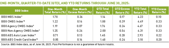 Credit card ABS outperformed auto loan ABS on a total return basis for the month and quarter ended June 30, while auto loan ABS outperformed credit card ABS YTD on a total and excess return basis.