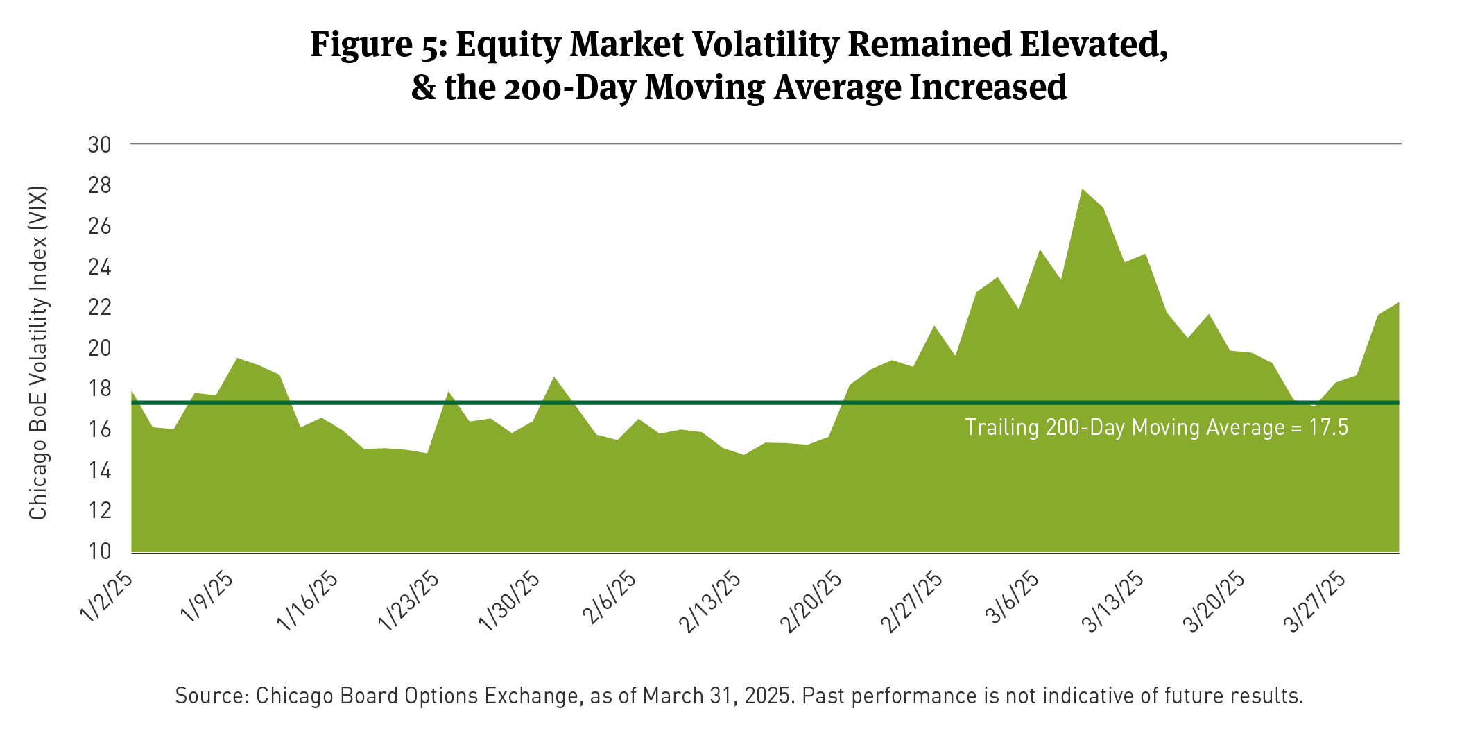 Cross currents from sometimes conflicting economic readings and policy announcements buffeted the markets, often leaving investors uncertain of which way to turn. Bond market volatility was elevated, especially through March, as measured by the Intercontinental (ICE) Bank of America/Merrill Lynch Option Volatility Estimate (MOVE) Index.6 (See Figure 1).