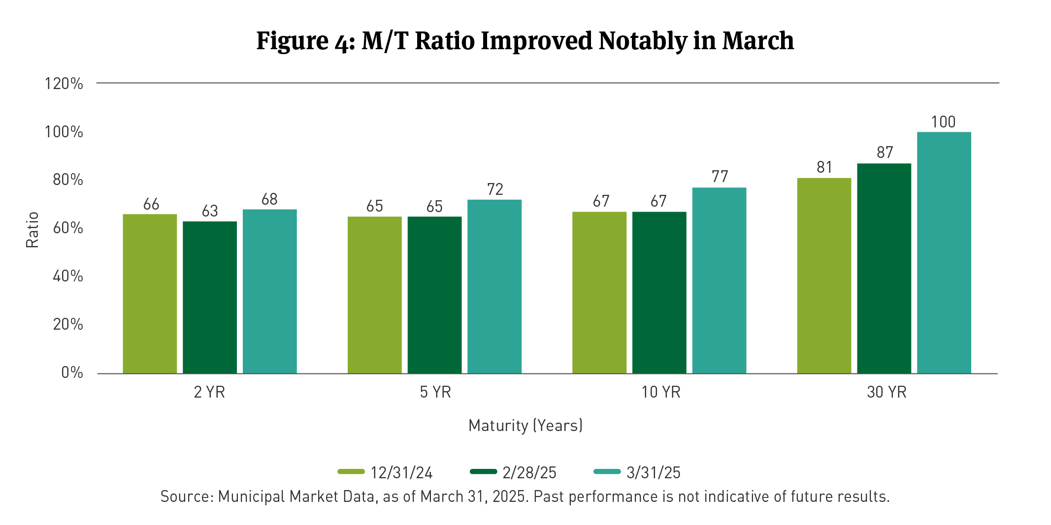 During the quarter, municipal bond yields were lower for very short maturities and higher from 10 years and longer, steepening the yield curve to a more normalized slope. Investors saw conditions that were potentially favorable for extending municipal bond maturities. (See Figure 3.) Over the course of the quarter and especially in March, Municipal/Treasury ratios9 improved. (See Figure 4).