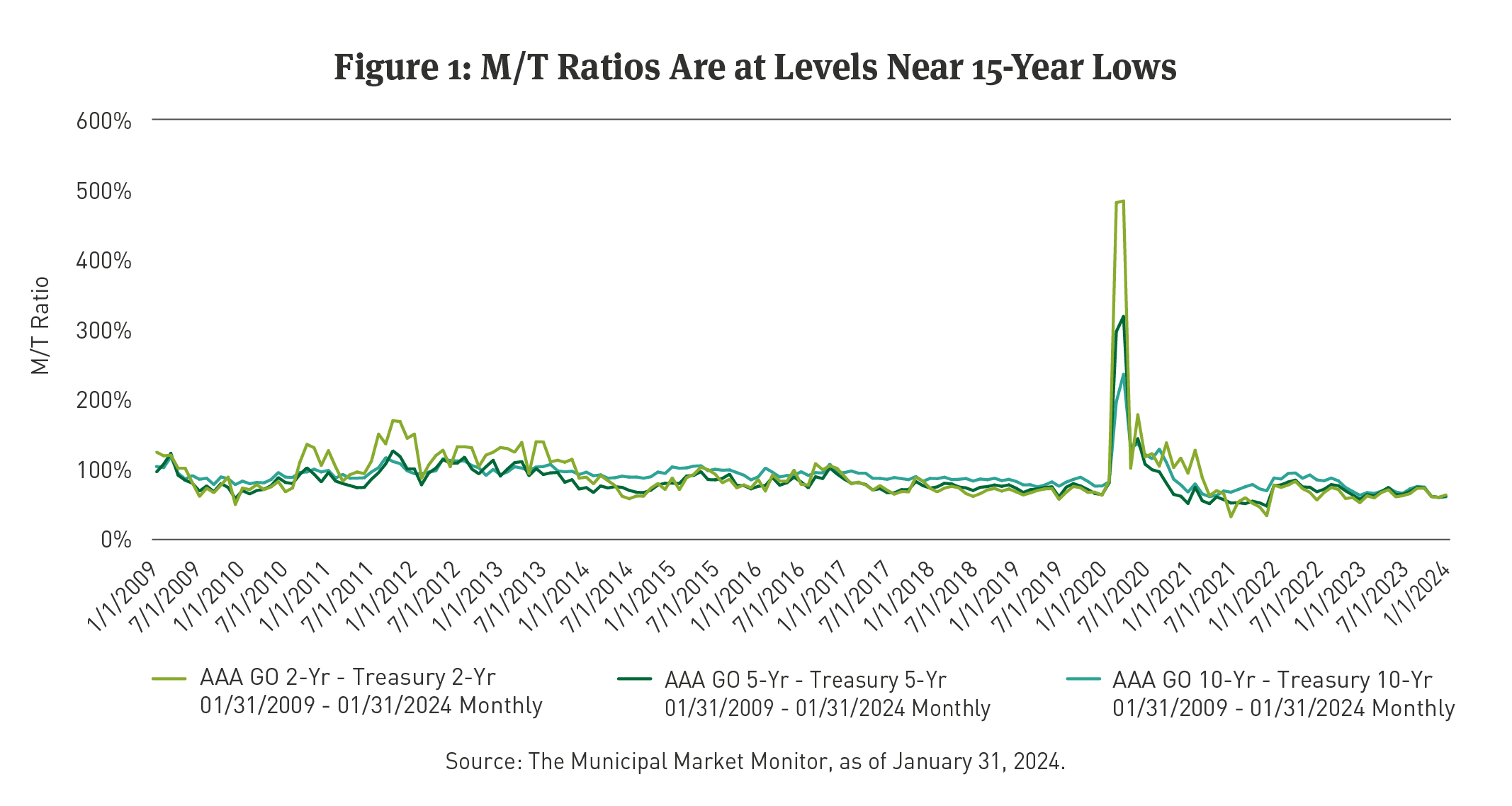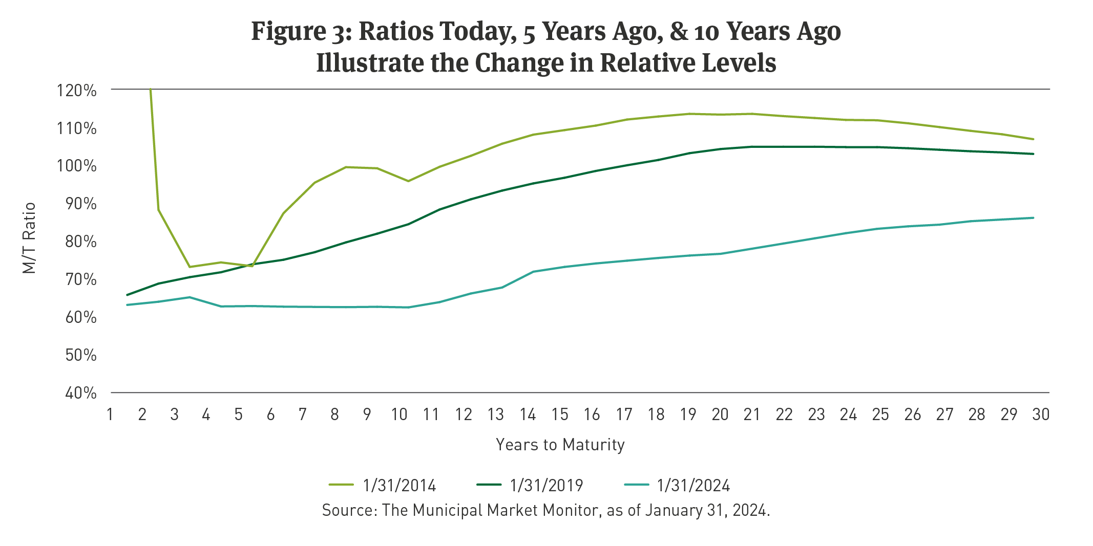For much of the past 30 years, the M/T Ratio has averaged between 80 percent to 90 percent across much of the Intermediate yield curve and even higher on the longer end of the curve. Looking back 10 to 12 years ago, ratios often traded well above that average for extended periods (See Figures 1 and 2).