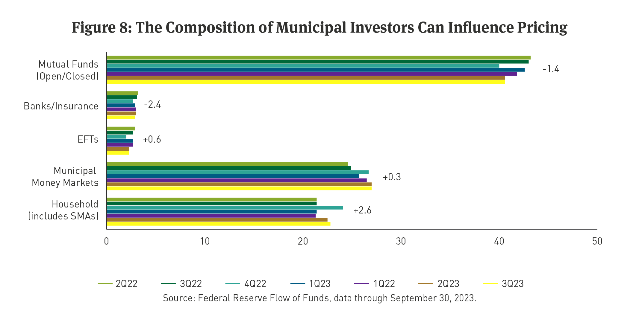 On the demand side, buyers are also accessing the market in ways that pressure ratios downward. As illustrated below, over the past two years two investor segments have grown at a faster clip while two other cohorts have declined as a proportion of market ownership. Specifically, households (of which Breckinridge SMAs are a part) and Exchange Traded Funds (ETFs) have become a larger part of the buyer base (See Figure 8). Banks, insurance companies, and mutual funds have seen their ownership decline. This shift has buoyed municipal demand, as households and ETFs are often steadier buyers of municipals than banks or insurance companies or tactical-oriented mutual funds.