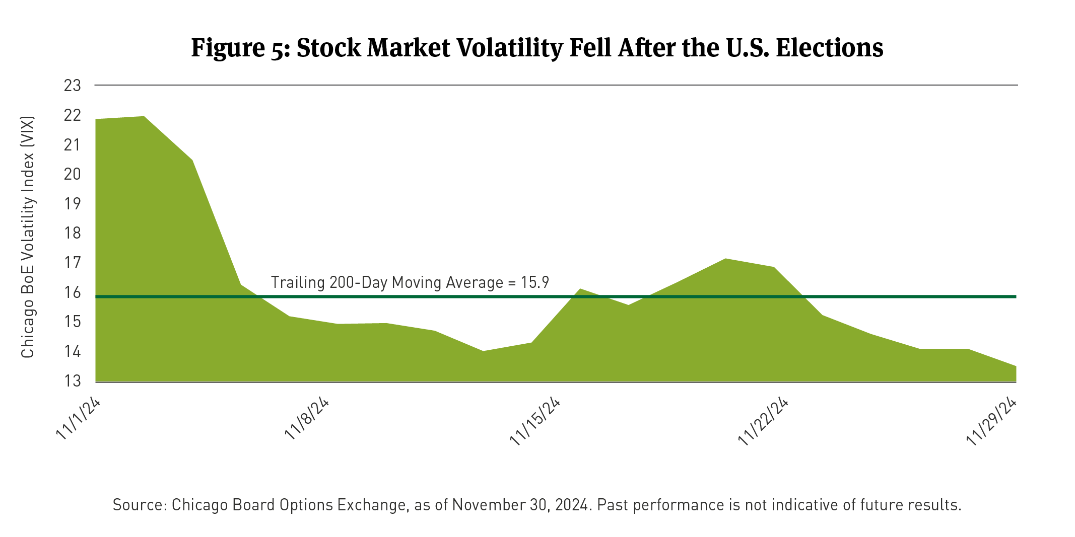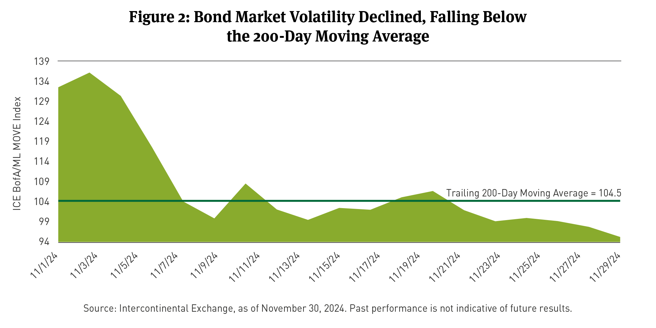 Treasury yields declined following the U.S. elections, as Republicans captured the Presidency and majorities in the U.S. Senate and House of Representatives. Coupled with positive economic news9 and a cut of 25bps in the federal funds rate, investors bid up Treasuries (See Figure 1).