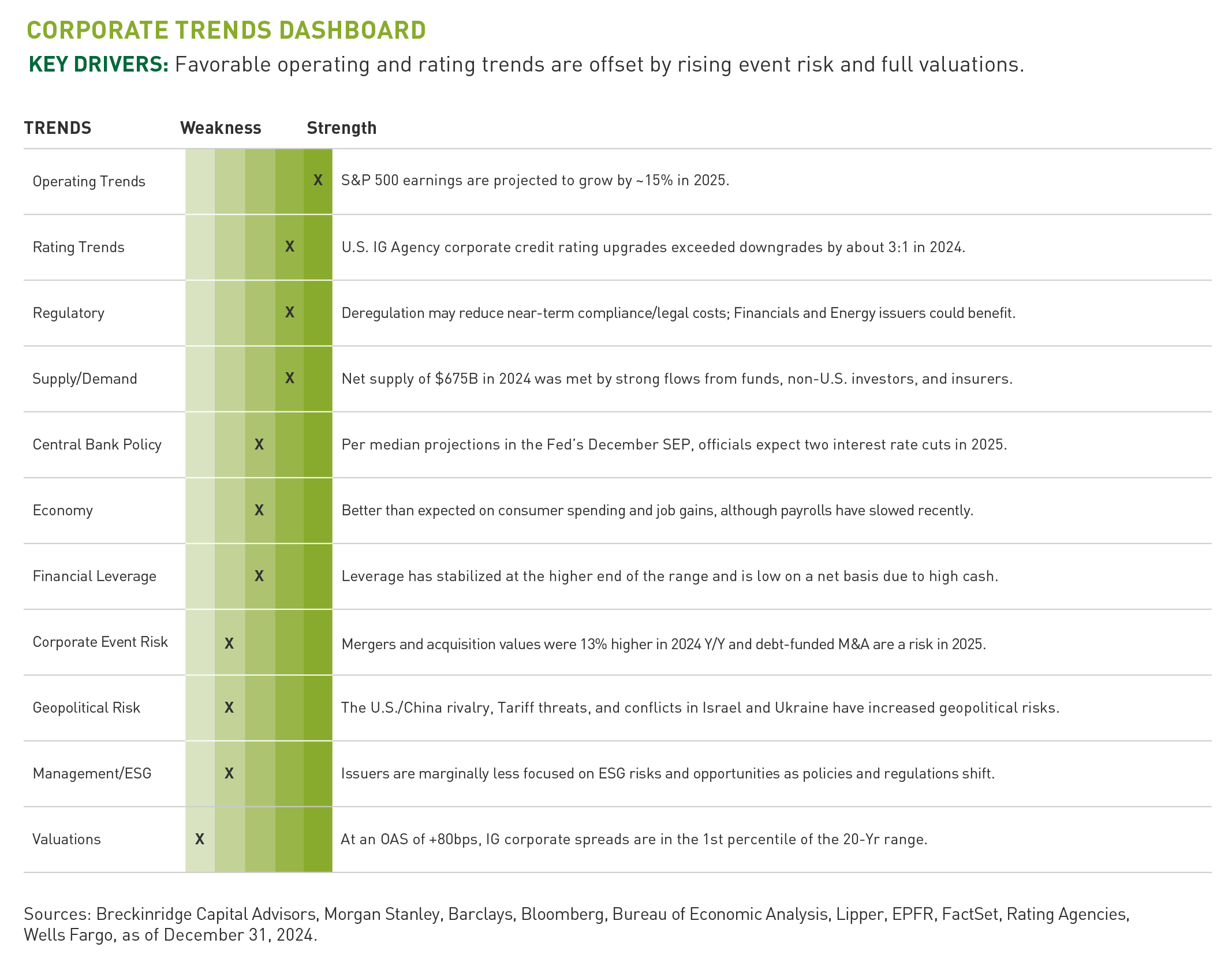Counterbalancing concerns are potentially favorable influences including deregulation that could reduce near-term compliance costs, especially benefiting Financials and Energy issuers, and stabilizing leverage at the higher end of the range and low on a net basis due to high cash levels among many issuers. Earning for companies in the S&P 500 Index6 (S&P 500) are projected by FactSet analysts to grow by 12 percent in 4Q24 Y/Y and 15 percent in 2025. Analysts believe earnings growth for companies outside the “Magnificent 77” will improve significantly in 2025.8