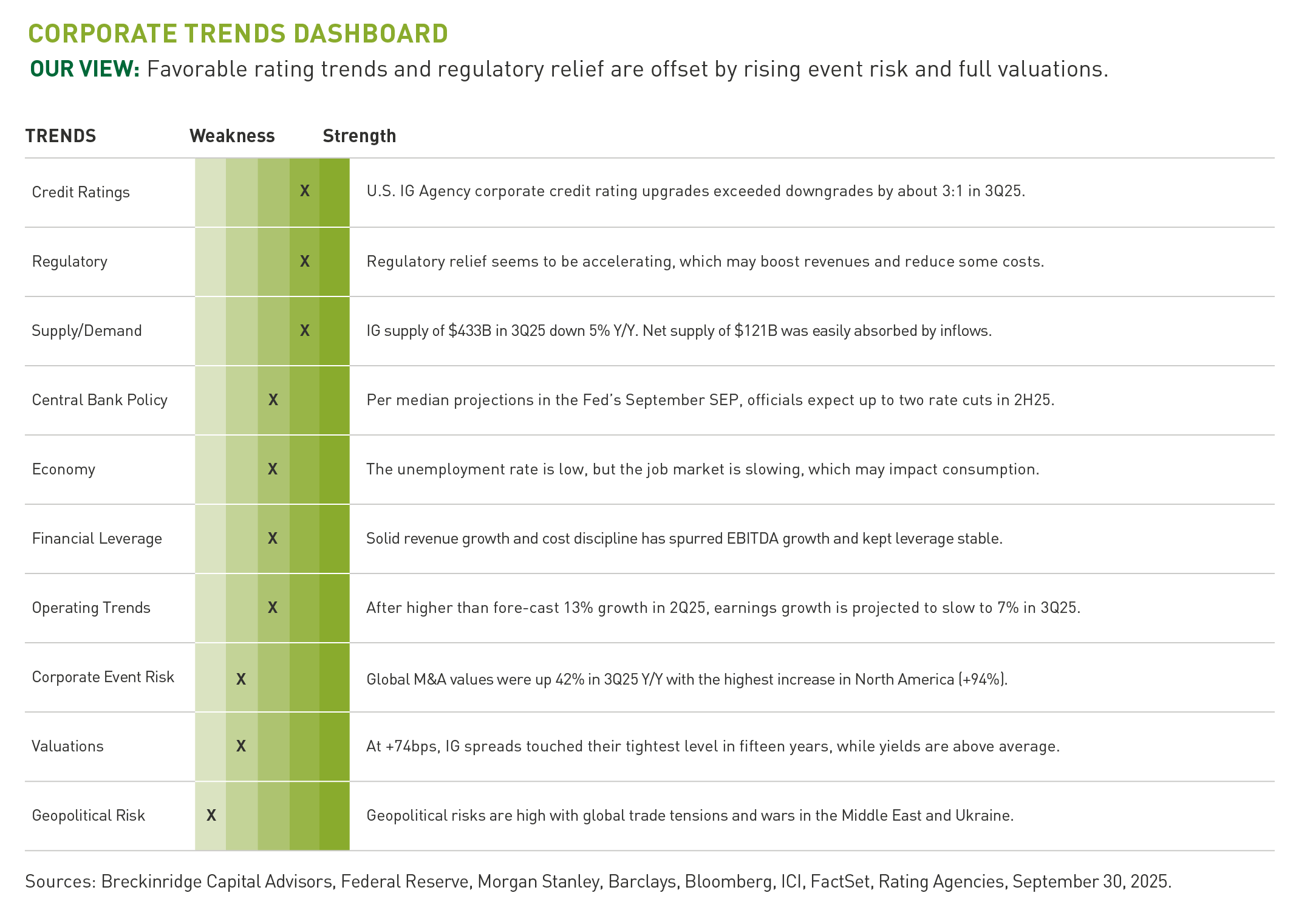 The Breckinridge Investment Committee’s (IC) base case is for sluggish job growth, tariffs driving sticky inflation measures, and moderating economic growth. Solid consumer spending, rising corporate capital expenditures, and elevated margins are partial offsets. Per median projections, in the Fed’s September Summary of Economic Projections (SEP), officials expect one or two rate cuts during the remainder of the year. Given our IC’s outlook for moderate growth, portfolio positioning is defensive with very tight valuations in most spread sectors, partially mitigated by attractive yields that continue to bring fund flows into the IG market.