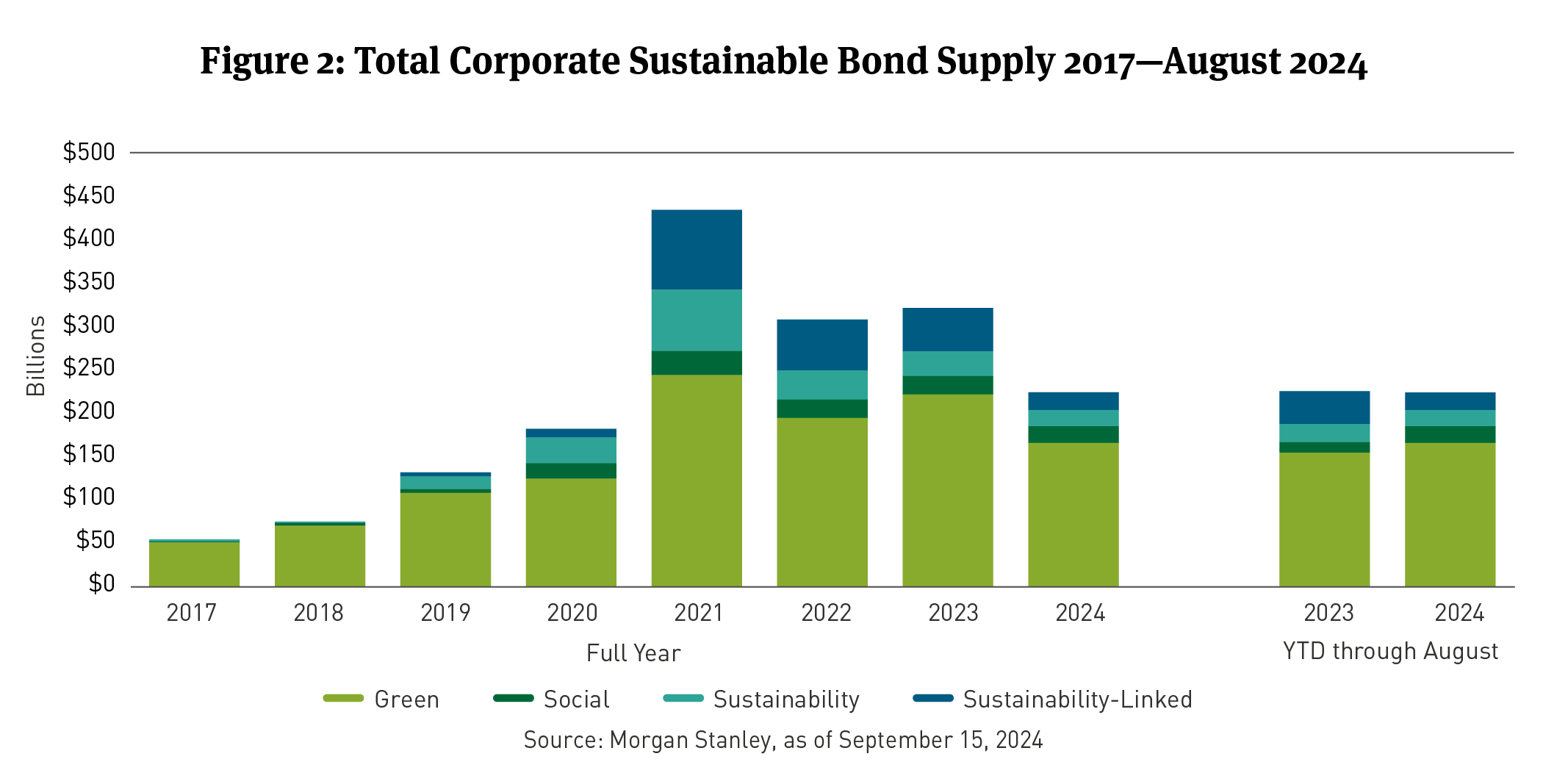 Corporate: Through August 2024 versus the same period in the prior year, the market saw a decrease in issuance from the financial and industrial sectors that was partially offset by an increase in sustainable bond deals from utilities. Overall, total issuance was essentially flat at $226.1 billion in 2023 compared to $224.7 billion in 2024 (See Figure 2).