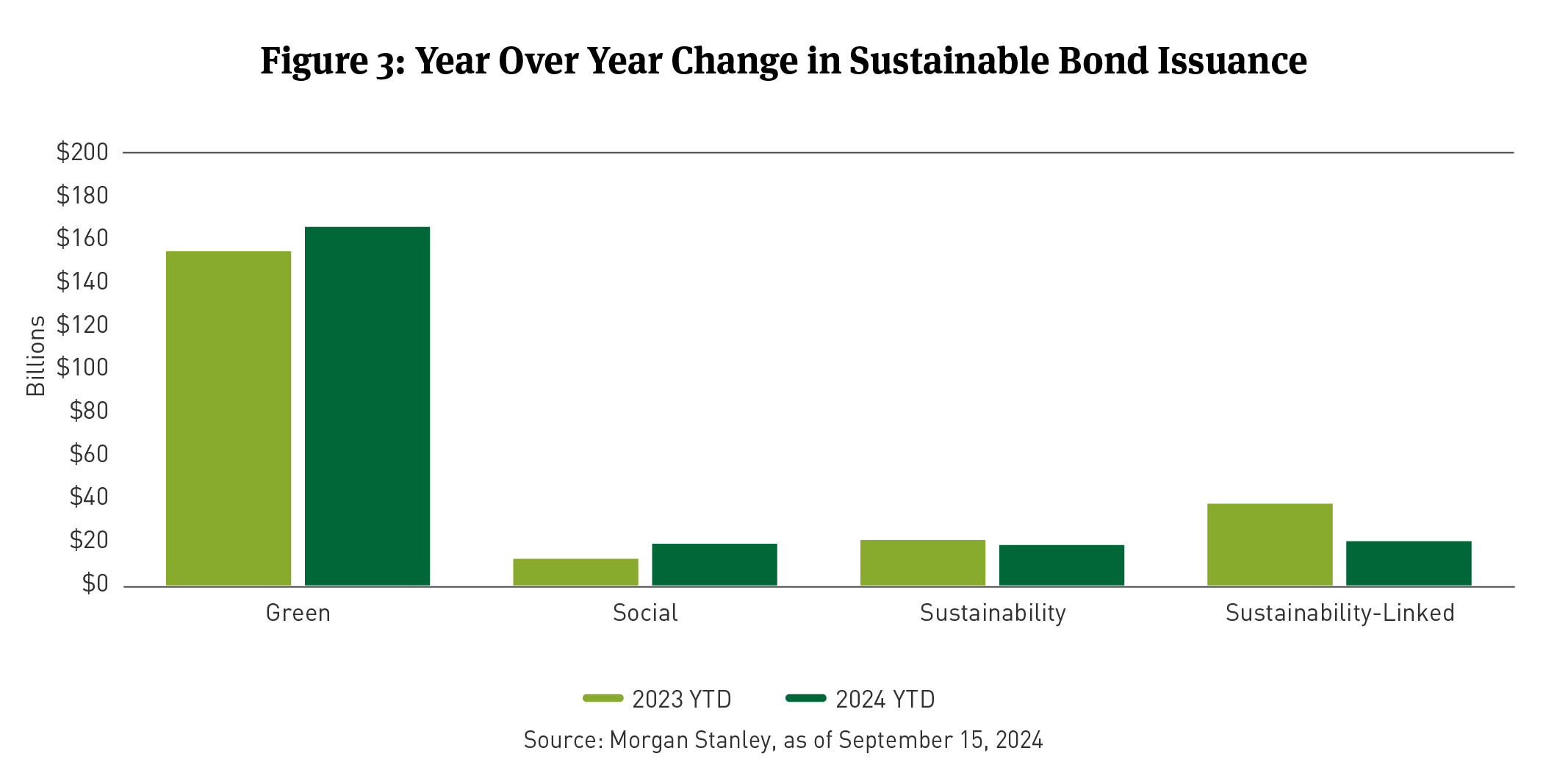 Sustainable bond supply from U.S.-based corporate issuers of $224 billion through August 2024 is 0.6 percent lower than the same period in 2023, per Barclays. Sustainable bond supply in the municipal market during the same period did not keep pace with the rest of the municipal market, although sustainable muni issuance was up year over year. Some parts of the securitized market saw sustainable bond increases, while increases overseas were more broadly distributed across sectors.