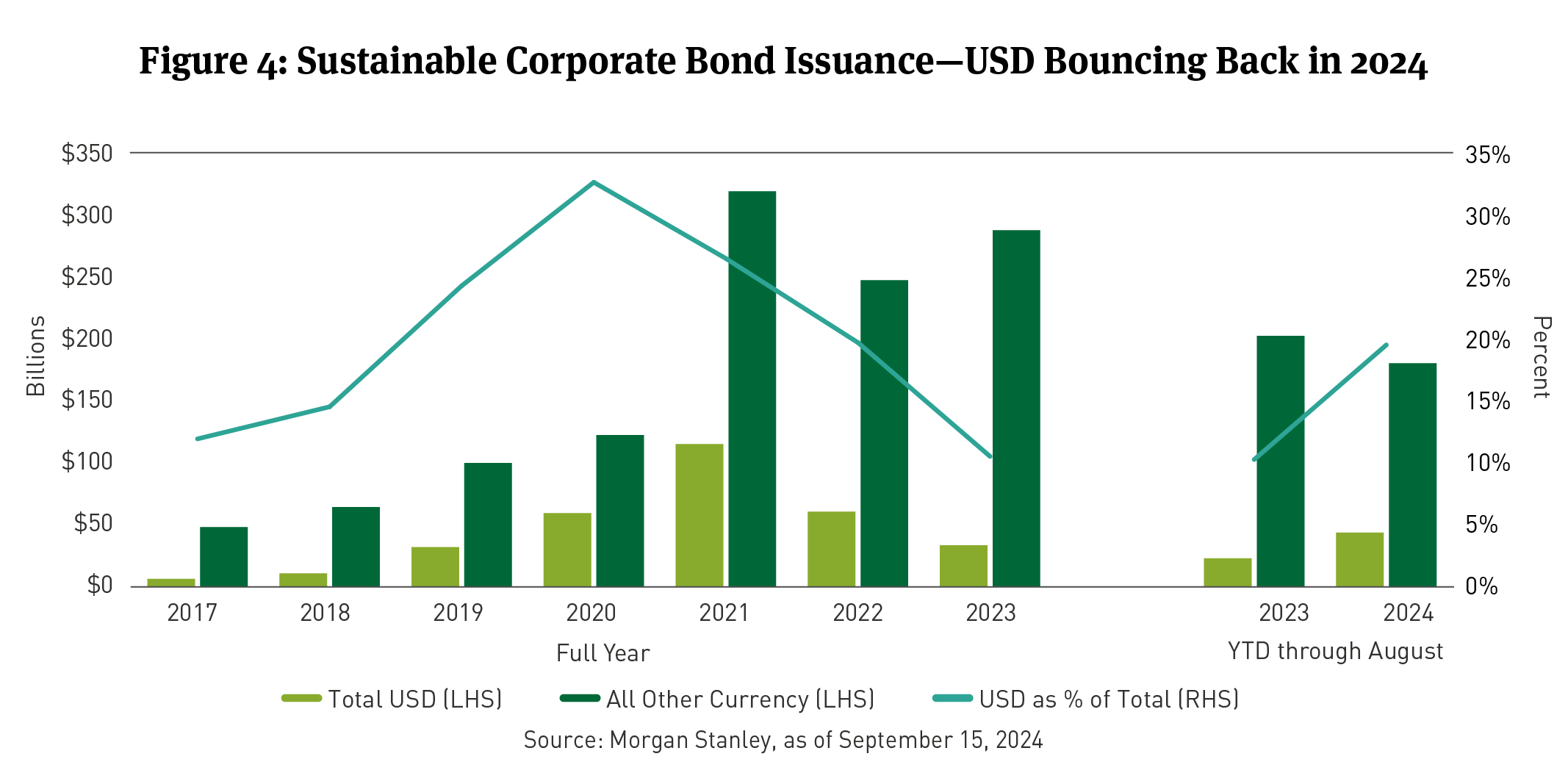 In terms of U.S. dollar (USD) corporate sustainable bonds, for the year-to-date period through August 2024, total issuance amounted to $43 billion, almost double from $23 billion in 2023. As a result, corporate USD issuance rose from 10 percent of total global sustainable bond issuance in 2023 to 20 percent in 2024 (See Figure 4.)